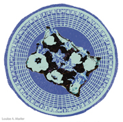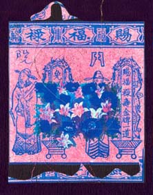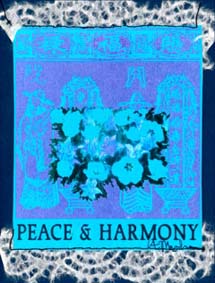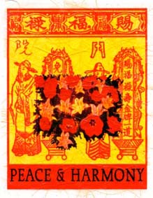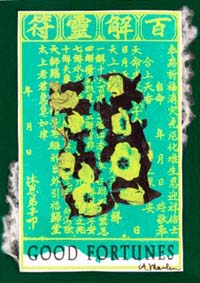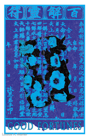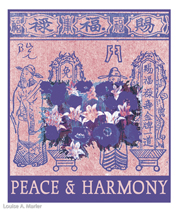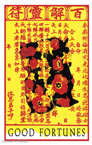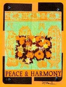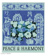 Ancient ceremonial papers are transformed into contemporary art. Louise took a 35mm photo of classic red and spiked yellow with red stripe tulips and turned the negative into an emulsion transfer. That was applied to traditional Chinese ceremonial papers of the same colors. The blending of the two layers created an abstract, contemporary, and poetic interpretation of the ancient messages, as well as a nice visual. Loose and actual Chinese translations add meaning. New color combinations create twenty-first-century joy!